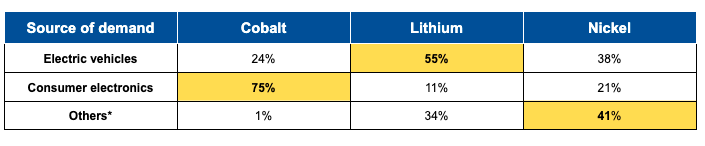 Table 1: Breakdown of demand for cobalt, lithium and nickel, 2019