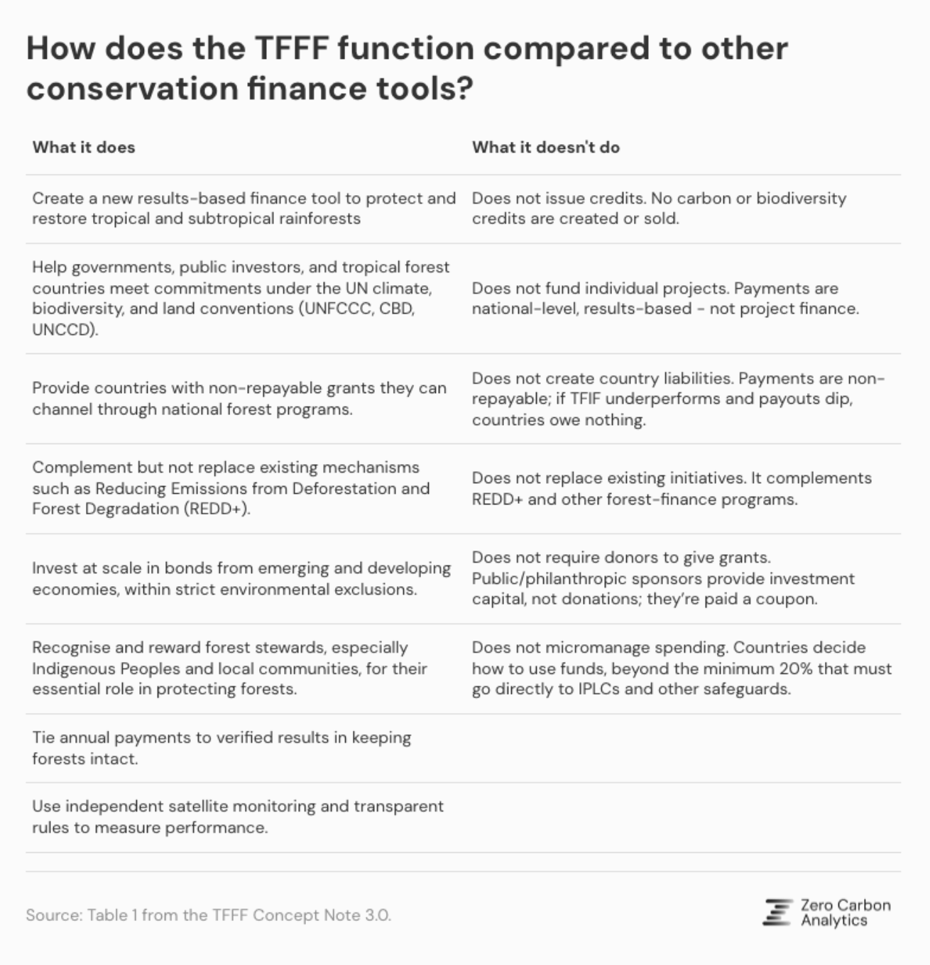 - In contrast to typical conservation funds, TFFF is a forest-funding mechanism that generates returns for its investors.