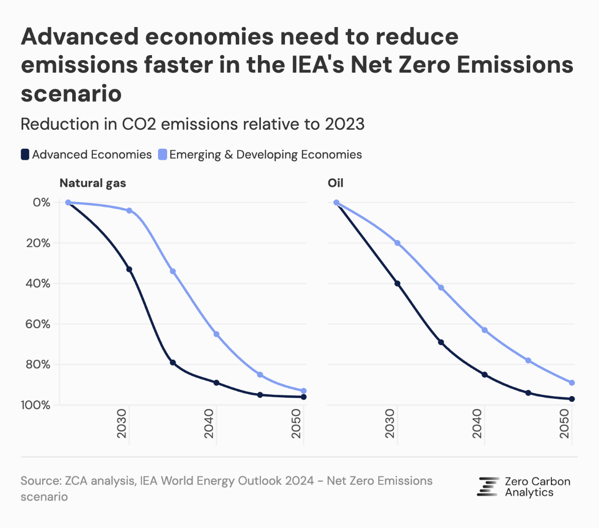- Advanced economies need to reduce emissions from oil by 40% by 2030, compared to 20% for emerging and developing economies. For gas, the difference is even greater, with a 33% reduction for advanced economies and a 4% reduction for emerging economies.