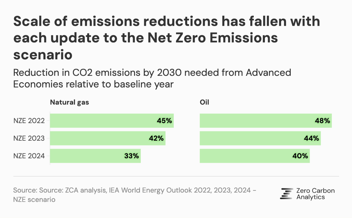 One reason for this lowering of ambition for emission reductions through 2030 is that the IEA has maintained a consistent rate of decline for advanced economies – 7% for oil and 6% for gas – even as the baseline level of current emissions has risen. This means that, rather than meeting the reality of rising emissions with rising ambitions for the pace of reduction this decade, the absolute level of emissions reduction has fallen with each annual revision of the NZE data.