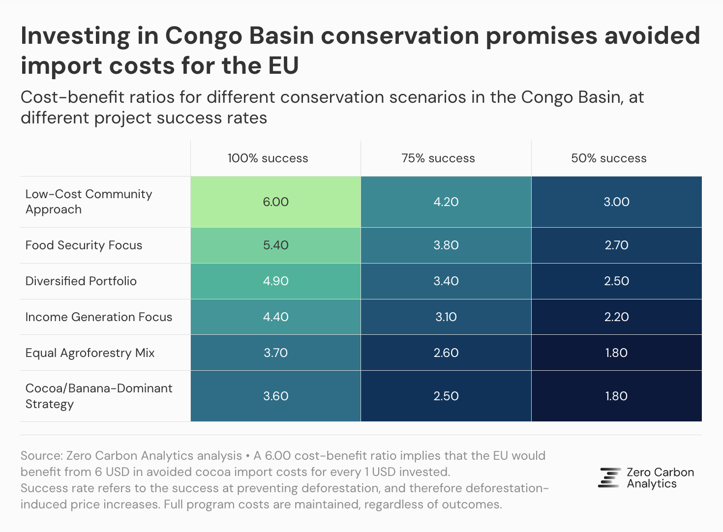 All of the intervention scenarios provide clear benefit-cost ratios by 2050,23Benefit-cost ratios (BCRs) were calculated as present value of avoided EU import costs divided by present value of intervention investments, with economic viability defined as BCR ≥ 1.0. when they are anywhere between 50% to 100% successful at preventing deforestation-induced price increases.24The analysis calculates the potential reduction in deforestation-driven cocoa price increases under varying intervention success rates (50%, 70%, 100%) to determine what portion of those projected price increases can be prevented, while maintaining full program costs regardless of outcomes. For example, a 50% success rate means that interventions successfully prevent 50% of projected deforestation (and therefore 50% of the associated modelled price impacts), but 100% of program costs are still incurred. Investments in conservation in the Congo Basin are robust, meaning they maintain positive returns even when projects are only 50% successful.25Our estimates are likely conservative because we have only included Ivory Coast, which accounts for approximately 50% of cocoa production in Africa, meaning the total economic impact of regional deforestation on EU importers could be larger when including other major producers such as Ghana, Nigeria and Cameroon.