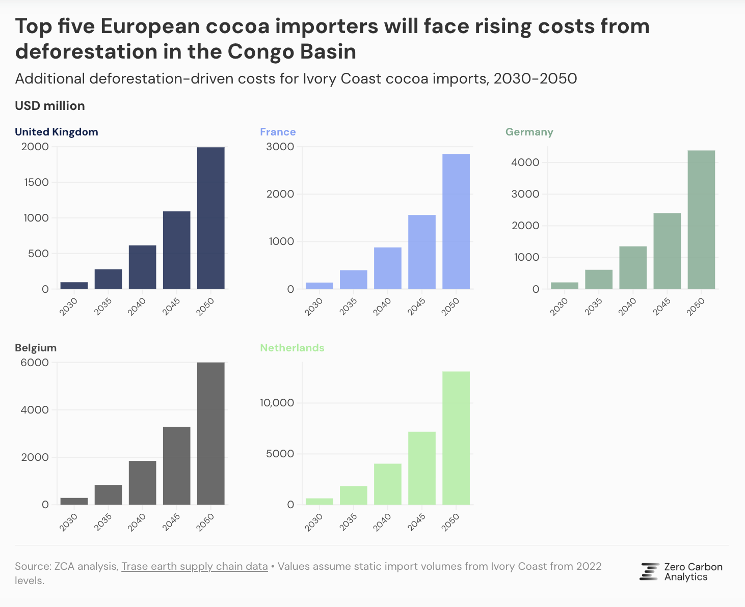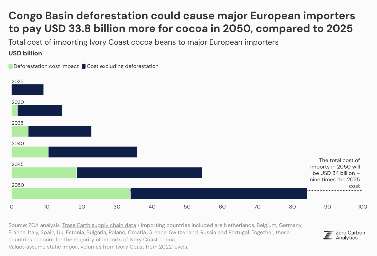 - In 2050, Europe could end up paying USD 33.8 billion more for the equivalent of its current annual imports due to Congo Basin deforestation. With normal market growth and the price impacts of extreme weather factored in, Europe’s 2050 cocoa imports could total USD 84 billion, nine times the 2025 cost.