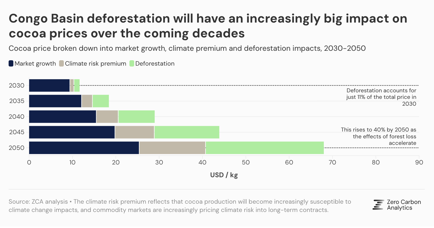 Without deforestation, normal market growth plus the climate risk premium would result in a 2050 price of USD 41 per kilogram, just over three times the peak price during the 2024 supply crisis. Deforestation risk escalates this price by nearly two-thirds.