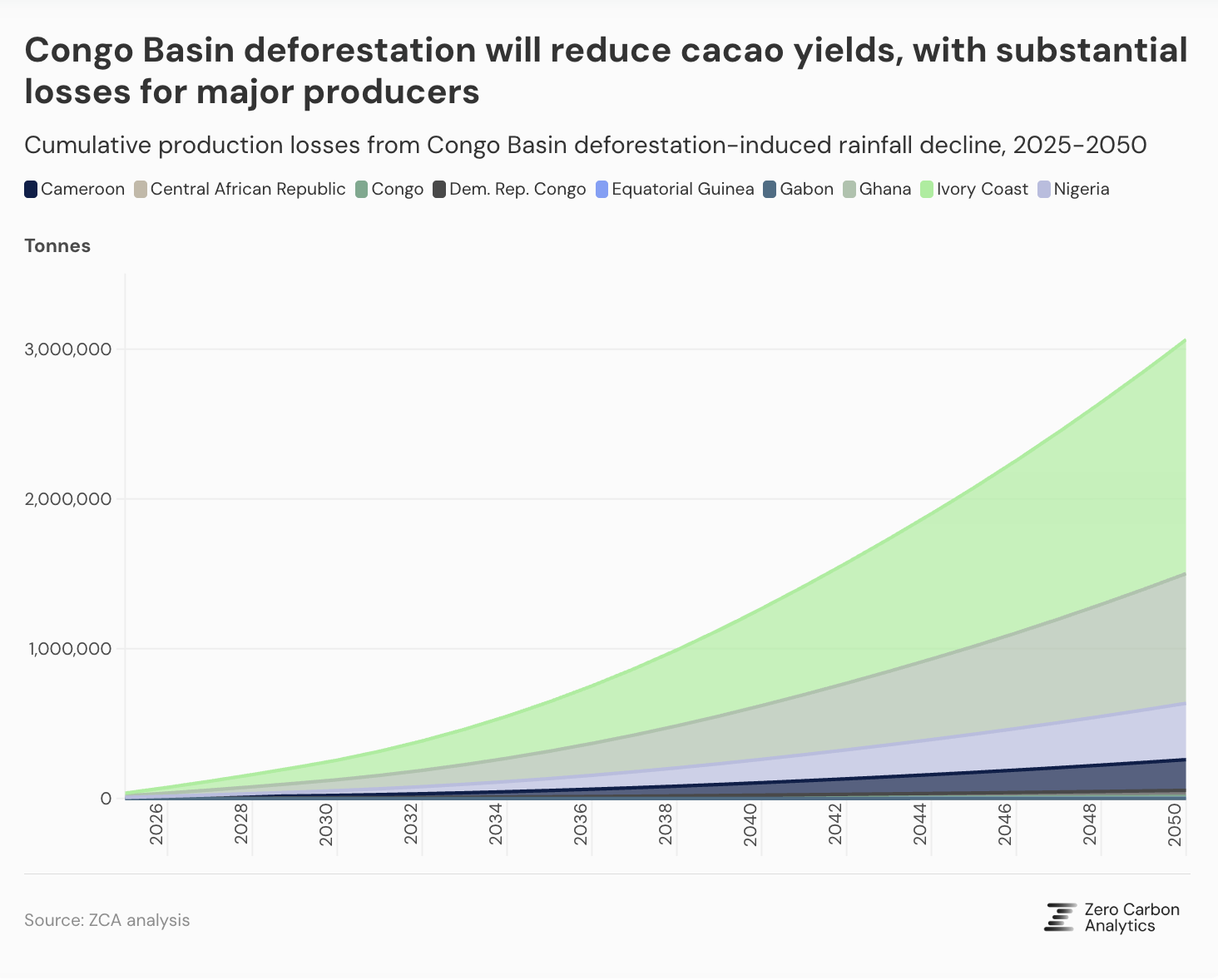 - New ZCA analysis finds that deforestation in the Congo Basin could disrupt rainfall and significantly reduce cacao yields, resulting in substantial losses for producers and rising costs for importers.