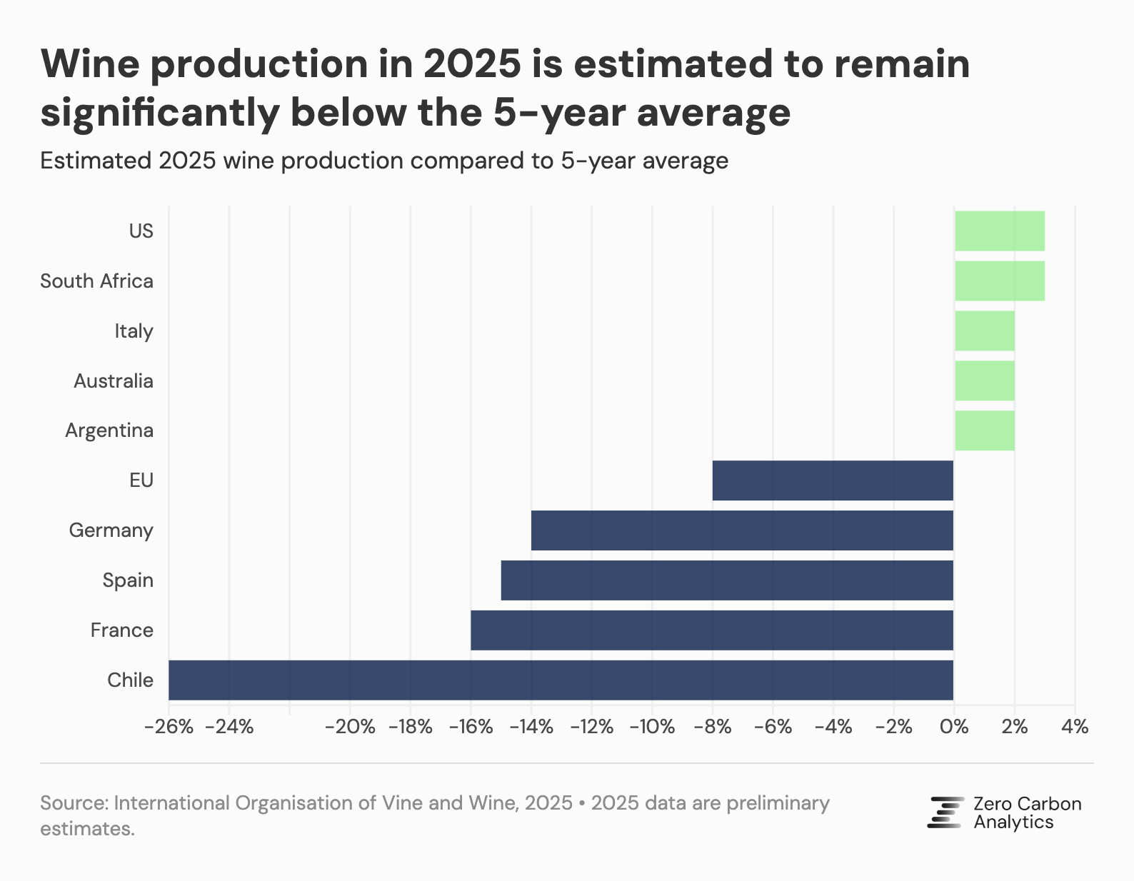 According to the International Organisation of Vine and Wine, climatic variability has been the dominant factor impacting global wine production in recent years. Impacts such as prolonged droughts, irregular rainfall, heatwaves, and unexpected frosts have reduced yields in large parts of Europe, South America, and Australia, contributing to a decline in production. The consumption of wine has also decreased, down 3.3% in 2024 compared to 2023 levels, which has also contributed to the decrease in production.